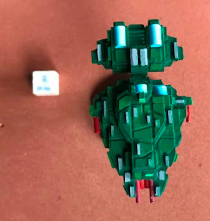 FT-626 Ardennes Class Light Cruiser is a sci-fi unpainted miniature from Ground Zero Games belonging to the Federal Stats Europa faction from Full Thrust. An 8mm white cube was attached for comparison purposes to the assembled and painted miniature.
