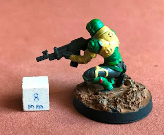 Hafza #1 is a 28mm sci-fi unpainted miniature from Corvus Belli produced for their skirmish wargame Infinity. An 8mm white cube was placed with the miniature for comparison purposes.